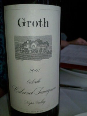 - 2001 Groth Cabernet Sauvignon Oakville, Father’s Day dinner at Nick & Stef’s Steakhouse: First bottle of ’01 Groth that we’ve opened. Quite big, even after all this time, but not overpowering. Complex and a bit spicy, drank very well on its own, paired exceptionally well with the dry-aged New York that is the specialty of the house whether I took the bite plain or with some Maytag blue cheese sauce, and even complimented the bread pudding we had for dessert. Yummy. Very yummy. So glad I’ve got more bottles left.