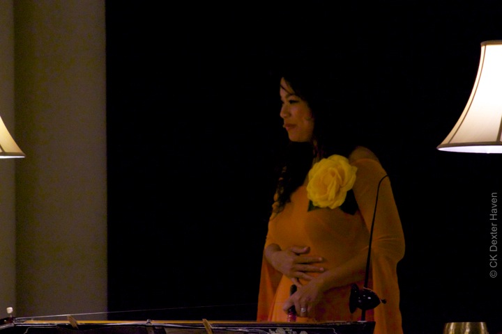 Ms. Võ’s performances this time around were less showy and attention grabbing, and instead more subtle. She first played two solo works, both her own compositions based on traditional Vietnamese folksongs. Music from Huế for dan bau, is based on melodies from Southern Vietnam; the second, Three Mountain Pass, inspired by the chầu văn style from North Vietnam, featured Ms. Võ singing lyrics by poet Hồ Xuân Hương as she accompanied herself with a small gong and tuned “singing bowls.” Both works had ethereal, other-worldly qualities, and both were brief: before you could start to wrap your head around them, they were done.