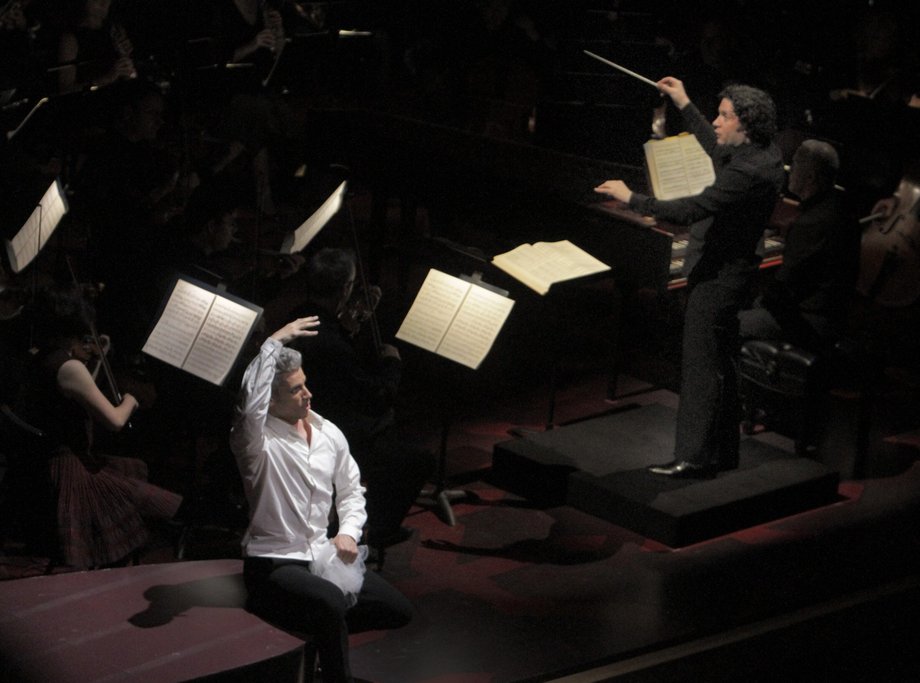 LOS ANGELES CA. MAY 17, 2013. Gustavo Dudamel conducting the LA Phil and Edwin Crossley-Mercer(left) as Figaro in opening night of L.A. Phil’s production of the opera “Marriage of Figaro,” at Walt Disney Concert Hall on May.17, 2013. The second in Gustavo Dudamel’s cycle of the Mozart operas with librettos by Lorenzo Da Ponte(Lawrence K. Ho/Los Angeles Times)